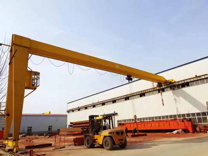 电动葫芦半门式起重机是有轨运行的中小型起重设备,主要由门架(主梁、支腿、下横梁等)、起升机构、运行机构及电控部分组成,以电动葫芦作为起升机构,工作时沿主梁工字钢下翼缘运行。门架一侧设有支腿,沿地面轨道上运行,另一侧无支腿,沿厂房上部轨道运行,其余结构和配置与MH型电动葫芦门式起重机一致。